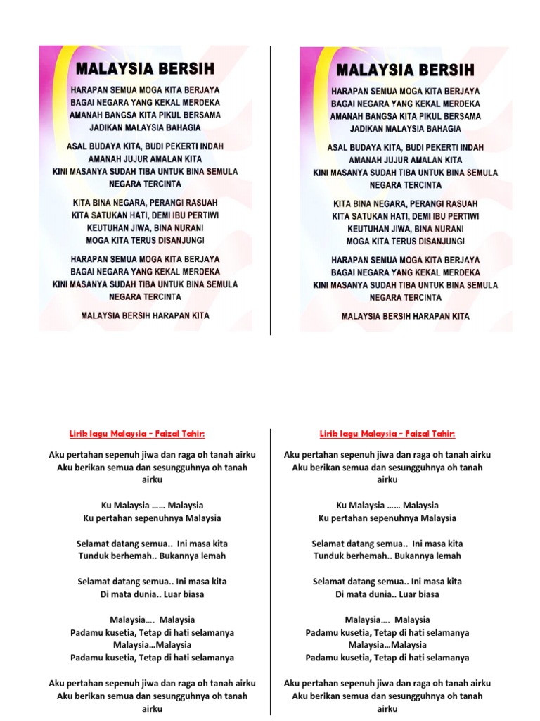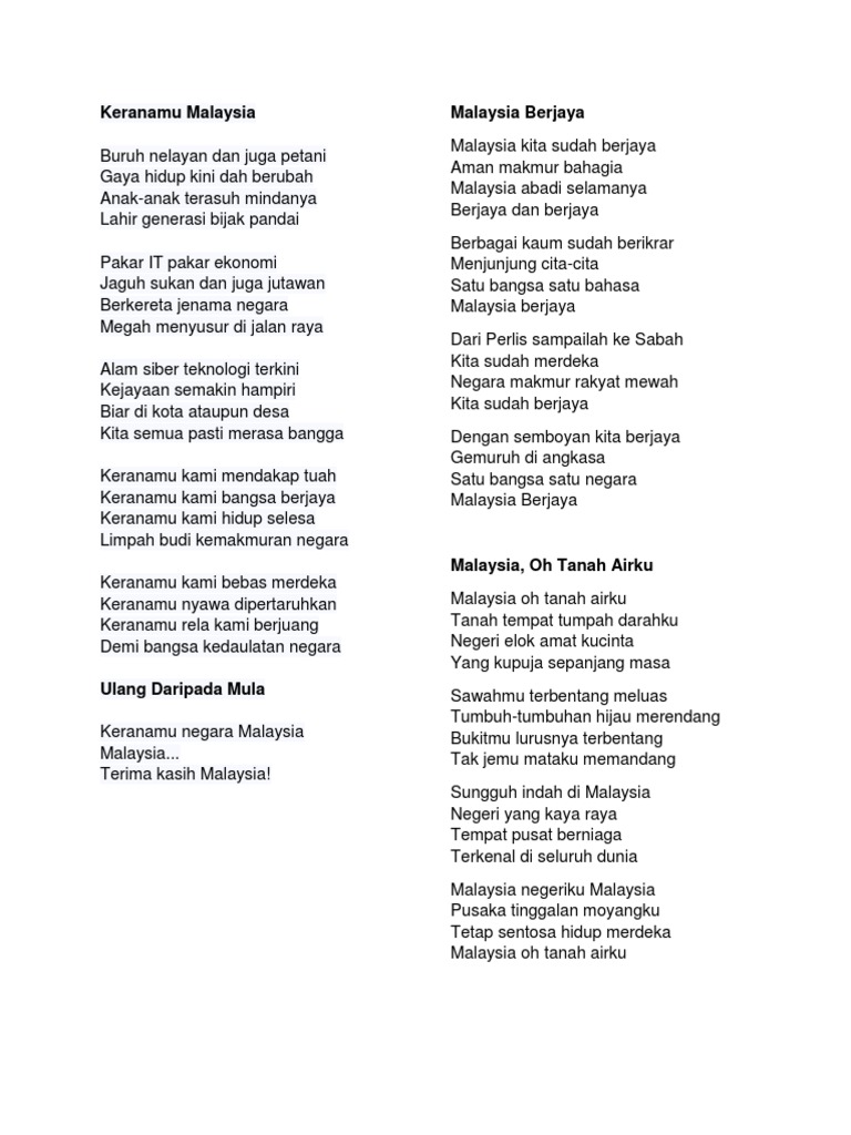 verse 1 aku pertahan sepenuh jiwa dan raga oh tanah airku. Kalau lynas dikatakan akan memproses 22,000 tan galian dan kandungan thorium adalah 10 peratus, mengikut anggaran save malaysia stop lynas (smsl). Chant ekor sejati harimau malaya, kami selalu ada, walau dimana berada, kami disini, terus menjadi, ekor harimau sejati woo ooo woo ooo woo ooo oo, woo ooo, woo ooo, ekor harimau sejati 3.chant takluk asia perwiraku. Tak jemu mata ku memandang. English translation you are the abode of beauty the green trees, adorning your beaches your princes and princesses smile happily stern, free, peaceful,prosperous, progressive! Tak jemu mataku memandang sungguh indah di malaysia. Negeri elok amat ku cinta. Aku berikan semua dan sesungguhnya oh tanah airku. Malaysia oh tanah airku, tanah tempat tumpah darahku negeri elok amat kucinta, yang kupuja sepanjang masa. Malaysia oh tanah airku (1) posted on julai 23, 2012 by musafir perjalanan. Malaysia oh tanah airku.tanah tumpahnya darahku. Yang kupuja sepanjang masa sawahmu terbentang meluas. Sajak bertajuk malaysia tanah airku memaparkan tentang keindahan, keunikan, ketulusan, semangat patriotik masyakat malaysia yang berbilang kaum guru vocal & arranggement by cg.