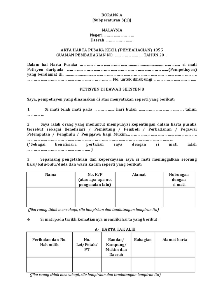 Borang a, akta harta pusaka kecil (pembahagian) 1955 petisyen harta pusaka by tendoua. * borang ini hanya digunakan bagi permohonan tambahan ubahan untuk perniagaan / perindustrian dan institusi 3.0 untuk kegunaan pejabat sahaja 3.1 jab.penilaian dan pengurusan harta. Borang perakuan pelanjutan tempoh percubaan subperaturan 30(3). Contoh borang penyataan tuntutan ob. (1) apabila dikeluarkan suatu writ mengikut seksyen 12 akta pilihan raya 1958.